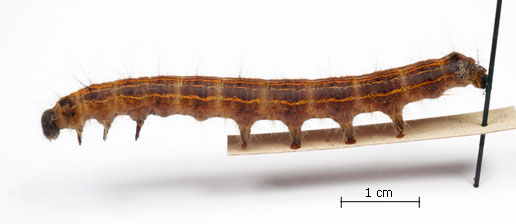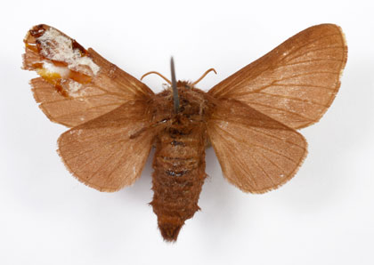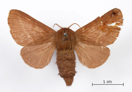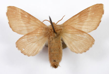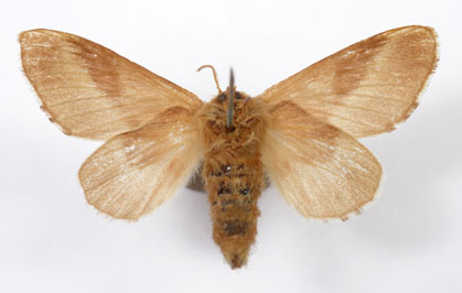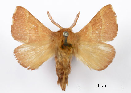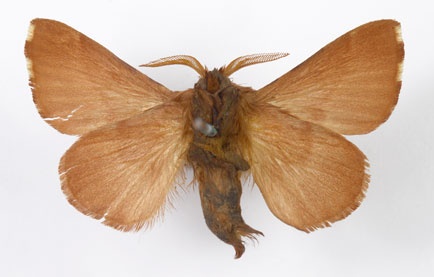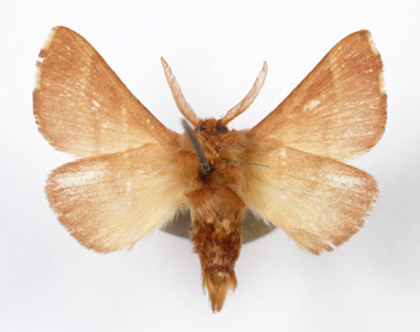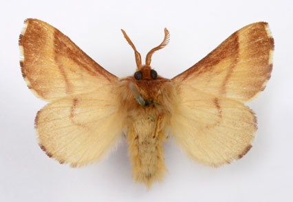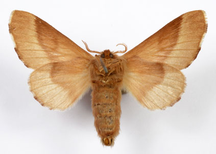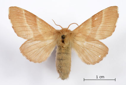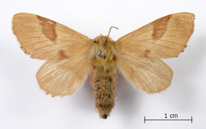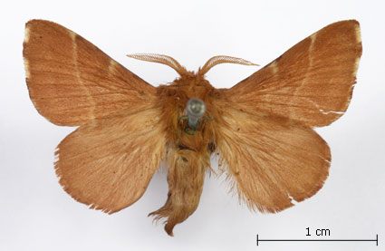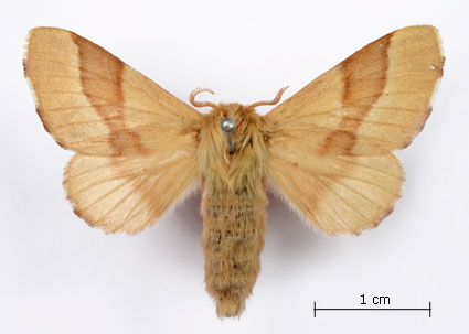 Envergure : 3,7 cm ; Malacosoma neustria f. pyri - Femelle |